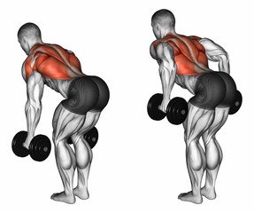 Take hold of some suitable weight dumbbells. Plant your feet firmly just inside shoulder-width, knees bent slightly. Your core is tight and your torso is angled forward from the waist but making sure not to arch your back over. Keep your head up and let your arms hang down perpendicular to the floor, palms facing each other holding the weight. This is the starting position.